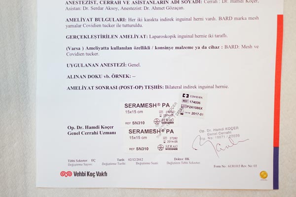Biz fıtık merkezi olarak hastalarmıza verdiğimiz ameliyat raporlarında kullanılan malzemenin etikenin yapıştırılmasına özen gösteriyoruz ve her hastamızın içinde ne tip yama olduğu, hangi doku katmanlarına yerleştirildiği, hangi yöntemle, hangi malzeme ile tutturulduğu hepsi yazılı oluyor.